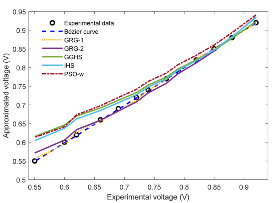 Figure 6 illustrates the comparison of the approximated voltage of M/S Ballard system with the experimental and the values obtained by the algorithms GRG-1, GRG-2, GGHS, IHS and PSO-w. The comparison illustrates and demonstrates that the Bézier curve method shows an excellent correlation between the approximated voltages and the experimental voltage.