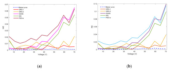 The performance of the Bézier curve method provides the lowest values for the statistical criteria, IAE and MAE, when compared to the other algorithms. Therefore, the Bézier curve method is ranked first in achieving the lowest of IAE and RE, while the ICA and FOA are ranked second and third, respectively. Therefore, the approximated values of the characteristic’s curves identified by the proposed Bézier curve method are very accurate because they are close to the experimental data of the fuel cell. The IAE and the RE for each measurement using optimal values founded by the Bézier curve method are depicted in Figure 15a,b. It observed that the Bézier curve method performs better than the reported algorithms.