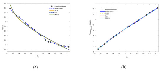 The reproduced V–I and P–I curves using the approximated Bézier curve method compared with the experimental data are presented in Figure 9a,b. Moreover, the quality and efficiency of the approximated values are reconstructed and compared with WOA, GA, and MRFO. It is clear that the reconstructed curves using the Bézier curve method are close to the experimental data.