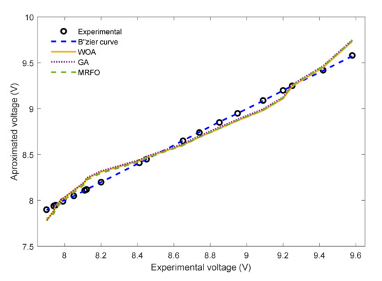 The accuracy of the Bézier curve method in the voltage approximation is illustrated in Figure 10. The approximated voltage is close to the experimental values, while the values obtained by WOA, GA, and MRFO are far. This shows that the proposed method outperforms the WOA, GA, and MRFO algorithms.
