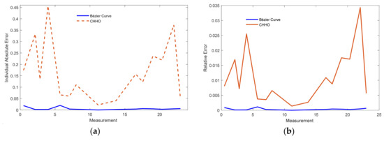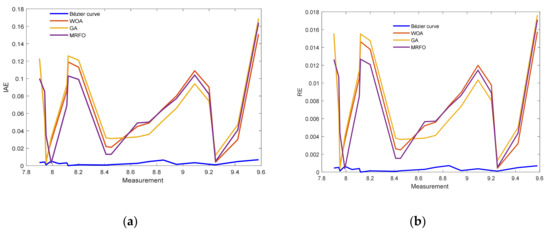 The comparison between CHHO and the proposed algorithm in terms of IAE and RE for each measurement is illustrated in Figure 19a,b. Figure 19 shows that the Bézier curve method has better performance than the other estimation algorithms.