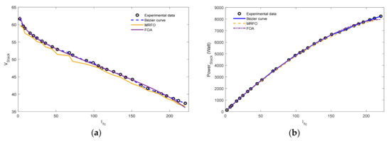 Figure 13a,b show the reconstructed V–I and P–I curves of NedStackPS6 PEMFC stack using the approximated value using Bézier curve method compared to experimental data and MRFO and FOA algorithms. The comparisons show that the reconstructed value using Bézier curve method is in good agreement with experimental data.