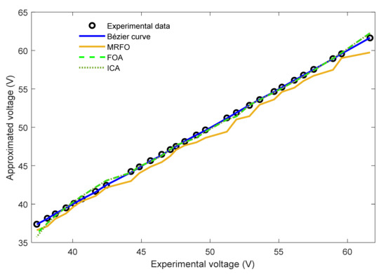 Figure 14 presents the comparison of the approximated voltage values with experimental and the value obtained by MRFO and DOA algorithms. The voltage value approximated by Bézier curve method is close to the experimental data better than the values obtained by MRFO and DOA algorithms.