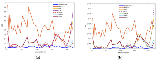 For more validity and accuracy, the statistical metrics in terms of IAE and RE are illustrated in Figure 11a,b. It is observed that the Bézier curve method provides the lowest value of IAE and RE compared to the algorithms WOA, GA, and MRFO.