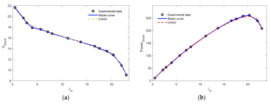 To validate the approximated pair current and voltage values obtained by Bézier curve method, they are used to reconstruct the V–I and P–I of the 250 W PEMFC stack. Figure 17a,b present the V–I and P–I characteristic curves of the approximated values by the Bézier curve method along with the experimental data. From the results, it can be observed that the values extracted by the Bézier curve method for the considered 250 W PEMFC stack fit the experimental data very well, and they are very close.