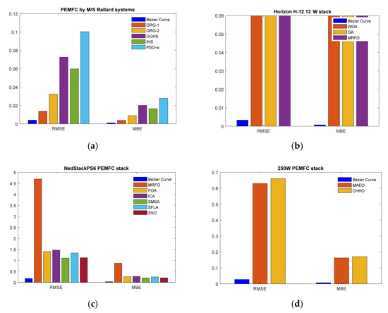 Comparison of RMSE and MBE of the fuel cells under study, (a) M/S Ballard Systems, (b) Horizon H-12 W stack, (c) NedStack PS6 PEMFC stack, (d) 250 W PEMFC Stack..