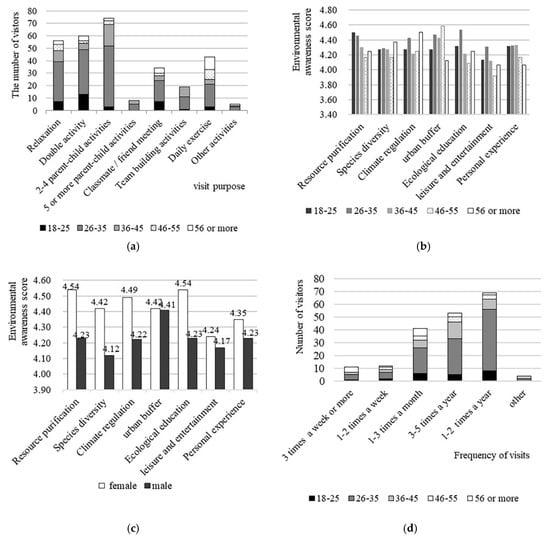 Socio-demographic profile of the tourist: (a) Number of visitors of different ages for different purposes, (b) number of visitors of different age with different tour frequencies, (c) environmental awareness scores for visitors of different genders, (d) environmental awareness scores of visitors of different age.