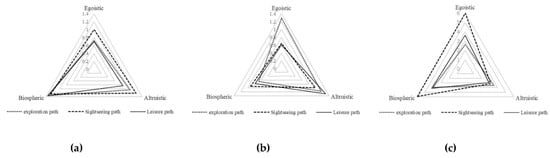 The fixation data of people concerned with different environments on threes tour routes are shown in Figure 5. Generally speaking, for both egoistic and altruistic concern, they both exhibit the longest fixation time on the wooden plank in the sightseeing path with the shortest first fixation time, indicating the path can quickly arouse the attention from such people. Those with their strongest concerns on the biosphere spend the longest time looking at the winding trails in the exploration path with the shortest first gaze time, demonstrating more visual attention. In addition, the fixation points of people with biosphere concerns on the winding trails are more divergent, and the subjects generally consider the exploration path to be more mysterious.