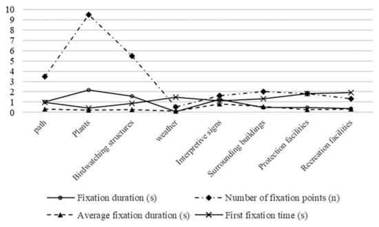 Environmental elements in the wetland park consist of tourist pathways, plants, bird-watching structures, interpretive signs, surrounding buildings, weather environment, as well as facilities for protection and leisure. Based on the comparison results of the first fixation time on each environmental element, we discover that time on plants, bird-watching structures, and interpretive signs is shorter, but with a longer fixation time period (Figure 6). Therefore, it is fair to say these elements in the wetland setting are easier to identify. However, the number of fixation points on plants is the largest with a random distribution, indicating that the search efficiency for plant information here is low and lacks intercorrelation.