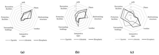 From the trajectory map and the heat map, the fixation points are mainly concentrated on the junction between the horizon and the road in the pictures, the bird-watching structures with significant morphological characteristics or the interpretive signs with sharp contrast in colors. The fixation points of those with an altruistic concern about the environment are scattered, and they put strong attention to the weather, interpretive signs, facilities for breaks. On the other hand, visitors with egoistic and biospheric concern exhibit a more concentrated pattern of fixation points, with the former on bird watching structures and the latter on plants. The former type of visitors have the longest fixation period and the biggest amount of fixations on the bird-watching structures, indicating that they are more concerned about them (Figure 7). Those with an altruistic concern show a short first fixation time for interpretive signs with a large number of fixations, and the information is captured quickly. Compared with those with egoistic and altruistic environmental concerns, visitors with biospheric concern gaze longer and more frequently at roadside plants and trails.