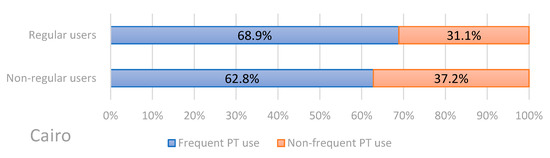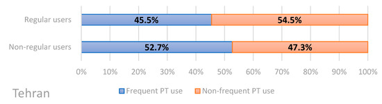 We asked the respondents how often they use public transport to compare the frequency of use of public transport between regular and non-regular users of ridesourcing. As it is explained, the answers to this question are dichotomized into frequent and non-frequent use of public transport. The results of this question are shown in Figure 3 and Figure 4 for Tehran and Cairo, respectively. In Tehran, 45.5% of regular ridesourcing users use public transport frequently, and 54.5% use this mobility mode almost never, rarely, or a few times per month; 52.7% of non-regular ridesourcing users use public transport frequently (every day or a few times per week), which means non-regular users of ridesourcing are more frequent users of public transport than regular ridesourcing users. The result of this question for the Cairo sample is in contrast with the Tehran sample. Regular ridesourcing users use public transport frequently (68.9%), more than non-regular ridesourcing users (62.8%). Hence, the results suggest that Cairene regular users of ridesourcing use public transport (PT) more frequently than Tehranian regular users.
