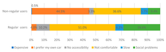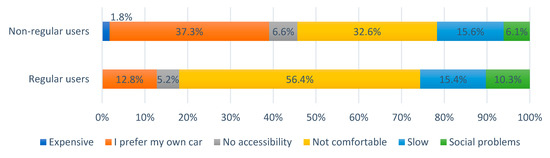 A multiple-choice question was asked to understand the reasons of regular ridesourcing users for not using public transport: “If you do not use public transit frequently, what is the reason?”. The answer to this question indicates the respondents’ attitudes and perceptions of public transport use. The choices of this multichoice question were designed based on the review of the studies in the field of mobility behaviors in the context of the MENA region [46,47,48,49,50]. The options include six reasons which are “I prefer my own car”, “It is expensive”, “It is not comfortable”, “No accessibility to public transportation”, “Social problems”, and “It is slow”. The respondents should choose only one option as the main reason for this question. We designed the options in the present form to gather subjective reasons associated with the way people decide not to use modes of public transport in their cities. The subjective factors are usually highly associated together and constitute a package of reasons for a decision. However, we asked them to select one reason because we tried to find the dominant subjective barrier in the mind of the respondent to using public transport, which may be useful for experts to understand which obstacles are more influential on the public perception. The reason “I prefer my own car” is related to lifestyle as Cullinane (2003) explained that the person is car-dependent and prefers using a car regardless of the quality of the public transport network. This reason might be correlated with the reason of “public transport is not comfortable”. However, if the comfort of public transport is improved, the person who mentioned “it is not comfortable” is more likely to use public transport than the person who mentioned, “I prefer my own car”, which is related to his or her lifestyle. The reason of social problems addresses social barriers for outside activities of women, fear of possible harassment, and inconvenience in public places. The answer “No accessibility/no public transportation” means that the public transport stations are not accessible or too far from the neighborhood or daily destinations of the respondent. The findings are shown in Figure 5 and Figure 6 for two groups of the binary variable “ridesourcing use” which are regular and non-regular users in Cairo and Tehran. The Chi-square test of independence indicates that in the Tehran sample, there is a significant association at 0.05 level (Pearson Chi-Square = 14.33 and p-value = 0.014) between the dummy variable “ridesourcing use” and the categorical variable “reasons for not using public transport” with the six mentioned categories. The findings in Tehran show that the major reasons of regular users of ridesourcing for not using PT are “not comfortable”, “slow transportation”, and “I prefer my own car”, which 56.4%, 15.4%, and 12.8% of regular users mentioned, respectively. The non-regular users reasoned, “I prefer my own car”, “not comfortable”, and “slow transportation” at proportions of 37.3%, 32.6%, and 15.6%, respectively. This finding shows that the subjective perceptions of comfortability and preference for using private cars instead of modes of public transport are the main reasons of regular and non-regular ridesourcing users for not using PT, but with significantly different percentages of the observations in the Tehran sample.
