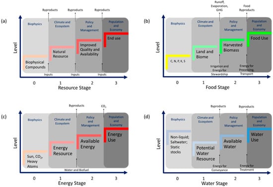 (a) Generic resource management. This provides the organizing principle for a WEF nexus framework. Biophysics, Natural Resource, improved quality and availability, and end use are the resource stages. Movement from a lower stage to a higher stage requires inputs. Each stage is influenced by the modifying factors of material cycles, climate and ecosystem, policy and management, and the population and economy, respectively. (b) Organizing principle applied to the food pillar. (c) Organizing principle applied to the energy pillar. (d) Organizing principle applied to the water pillar. Note that stage 0 can be at a higher level than later stages. This represents the capacity of some natural transitions to happen spontaneously.