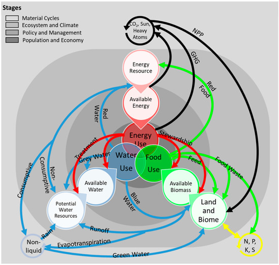 The organizing principle, system components, interactions, and modifying factors are combined to create a simplified representation of the WEF nexus (Figure 2). Figure 2 is complex at first glance, but a few comments will reveal its intrinsic simplicity. The circles, shades, and arrows represent the stage hierarchy, modifying factors, and system connections, respectively. Black arrows represent carbon flows. Arrows going from lighter to darker gray generally represent anthropogenic connections; while those going from darker to lighter gray generally represent natural connections. Crossing arrows represent the presence of a first order feedback. The topological representation in Figure 2 can be expanded to contain more detail by including additional stages, threads, and connections.