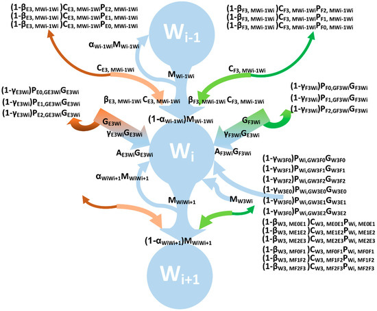 Nodes are represented as follows: ResourceStage with resources referred to as W, E, and F and stages with 1, 2, 3, and 4. Intra-resource flows (M) are represented as where the indices I and j can have a value of 1, 2, or 3 and the index X can represent F, E, or W.