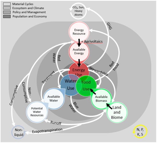 Here, we demonstrate how the nexus system changes if a disruptive technology is added. We consider the emerging case of agrivoltaics within the proposed framework. Agrivoltaic systems combine agricultural activities and solar energy production on the same land area. This has shown to be mutually beneficial in a nascent literature on the subject [25,26,27,28,29]. Figure 5 considers all the nexus connections, identified in Figure 2 demonstrating the general nexus framework, and highlights those connections and resources that would incur major disruption or alteration.