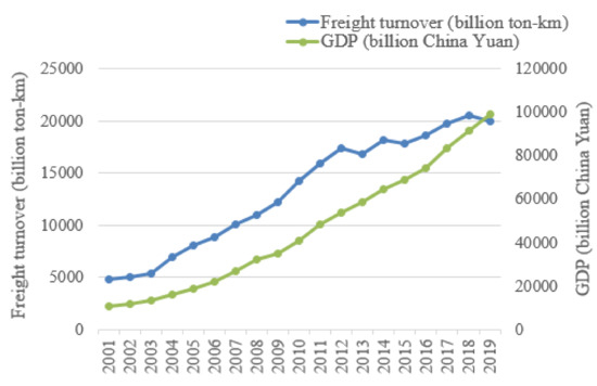 Accelerated by the policy of reform and opening-up, China has achieved an astonishing economy expansion in the past four decades, which has brought the prosperity of the logistics industry. To a certain extent, freight turnover can reflect logistics scale. Figure 1 represents the change trends of freight turnover and gross domestic product (GDP) from 2001 to 2019 in China. To be specific, China’s GDP increased by approximately 9.05 times in this period, and the freight turnover volume increased by 4.18 times, reaching up to 19,928.71 billion ton-km [1]. This indicates that the development of the logistics industry has made some achievements benefiting from GDP growth. However, it still resides at a lower level compared with developed countries [2]. A notable characteristic is that the logistics performance is low, while the logistics cost is high. To address this issue, China’s government has launched serial policies to improve logistics performance. Some specific measures are advocated, such as establishing a national logistics hub system to match the modern industrial system, building an efficient multimodal logistics system, and promoting the interconnection and sharing of logistics information. It is often quoted that “if you cannot measure it, you cannot manage it”. The performance evaluation of the logistics industry is the first step to improve logistics efficiency. Following Fugate et al. [3], the term “logistics efficiency” is defined as the ratio of the actual values of the inputs and outputs of the logistics system to the optimal values of them in this study, which can reflect the operational performance of logistics system. Effective performance evaluation can provide decision support for the government to develop better policies to allocate resources and improve logistics performance. Consequently, it is necessary to investigate logistics efficiency in China.