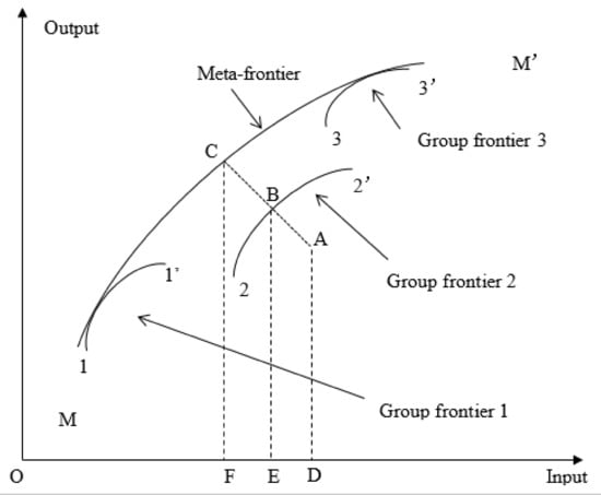 To this end, this paper emphasizes the existence of technology heterogeneity in logistics production with the consideration of CO2 emission. Hence, an analytical framework for evaluating logistics efficiency integrating the metafrontier and slacks based measure (SBM) is proposed. The core concept of the metafrontier aims to emphasize that production technology heterogeneity exists among decision-making units (DMUs), which is determined by the intrinsic attributes of DMUs, such as region, type, and scale [17,18]. An evaluated object can be regarded as a DMU. Based on the sources of technology heterogeneity, all DMUs can be classified into several groups. Each group has an independent production frontier, called group frontier. A global production frontier can be constructed to include all group frontiers, called a metafrontier. Subsequently, the metafrontier concept is widely used in the studies of efficiency estimation [18,19,20,21]. Furthermore, logistics inefficiency is also broken down in this study.