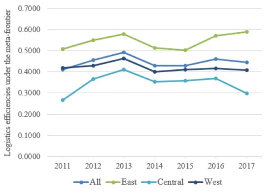 As shown in Figure 4, logistics efficiencies under the metafrontier were rising slowly in the whole country during the observed period. Overall, the logistics efficiency at the national level increased from 0.4109 in 2011 to 0.4449 in 2017. The efficiency was presented at the regional level as follows: in the east and central areas, it rose from 0.5074 to 0.5889, and from 0.2668 to 0.2975 respectively, while in the west area it slightly reduced from 0.4191 to 0.4081.