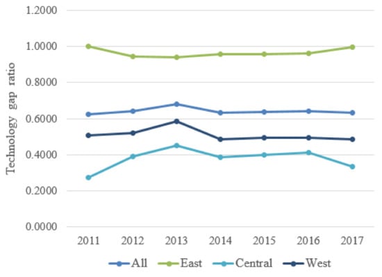Compared with the other two group frontiers, the east group frontier was the closest to the metafrontier. Nevertheless, the logistics efficiency under the group frontier of the east area was low. The main reason for this was that the efficiencies of the eastern regions were scattered. In contrast, the central group frontier was farthest from the metafrontier. Although the efficiencies under the metafrontier were low, the central regions had higher scores under the group frontier because of their relatively concentrated distribution. The efficiency value of the west area was between the east area and the central area. This phenomenon can be explained from the view of technology gap ratio.