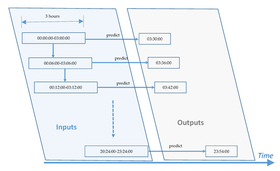 where t is the current time interval and   x t is the arrival traffic flow rate during the current time interval. Since the traffic flow rate is at a 6-min interval, the vector ( x t 29 ,   x t 1 ,   x t ) represent the arrival travel flow rates during the past 3 h and x t + 5 represent the predicted rate of the traffic flow that will arrive at the intersection after half an hour. Figure 1 shows the inputs and outputs of the developed models.