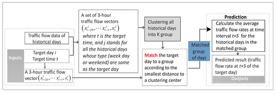 The general framework of the clustering-based algorithm is presented in Figure 2. Given a target day i and a target time t, we will know the 3-h traffic flow condition before this time. Then, by applying the clustering method to the corresponding historical traffic flow vector group, the historical days that have a similar traffic pattern as the target day during the same 3-h period on the same type of day of the week can be identified. Then, by calculating the average traffic flow rates at time interval t + 5 (30 min after the target time t) in these identified days, the traffic flow rate for the target day 30 min after the target time t can be predicted.