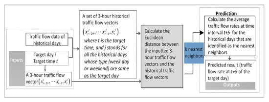 KNN is a non-parametric method that can be used for classification and regression. In this study, KNN was used for regression. The core idea for the KNN regression is to find the k nearest neighbors of a given set of inputs and use the average values of the k nearest neighbors as the outputs of the model. In this study, the input for the KNN model is the 3-h traffic flow vectors ( x t 29 ,   x t 1 ,   x t ) of the target day at a given time t. To identify the k nearest neighbors for the inputs, the distance between this input and the samples in the training data needs to be defined at first. In this study, the Euclidean distance given in Equation (2) is also used for defining this distance. Similar to the Clustering method, the KNN method also aims to find out all the historical traffic flow records that have a similar pattern to the target day in a given time period and a given type of day (weekday or weekend), so as to predict the traffic flow rate in the next half hour for the target day. The only difference is that the Clustering method identifies all the traffic flow vectors in the same clustering group, while the KNN method only identifies the k most similar records that are closest to the inputted traffic flow vectors.