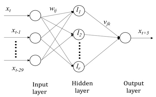 The BP neural network algorithm is one of the most widely applied neural network models and has been applied for traffic flow forecasting in some previous studies [31]. In this study, a BP neural network is selected with three layers: (1) an input layer, (2) a hidden layer, and (3) an output layer. The overall structure of the BP neural network is presented in Figure 4. In this structure, there are 30 neurons in the input layer, i.e., ( x t 29 ,     x t 1 ,   x t ) which represent the 3-h traffic flow rate vectors and 1 neuron in the output layer, i.e., x t + 5 which is the traffic flow rate in half an hour; wij is the weight for the connection from neuron i in the input layer to neuron j in the hidden layer, and vjk is the weight for the connection from neuron j in the hidden layer to neuron k in the output layer. The training of the BP model was based on the backpropagation method. In this study, the transfer function for the neurons in the hidden is chosen as the sigmoid function and the transfer function for the neurons in the output layer is a linear function.