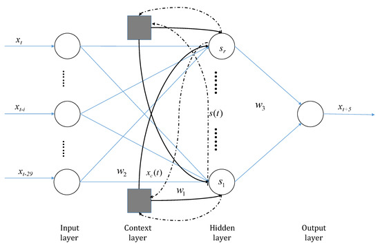 In this study, a simple three-layer Elman network was adopted. Figure 5 shows the structure of the Elman network. The relationships between the neurons in different layers of the network can be expressed as: