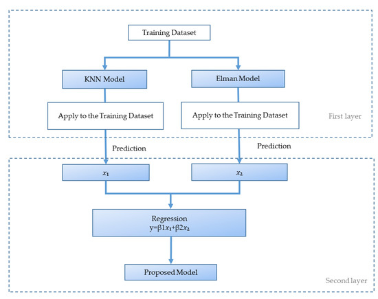 An individual prediction model often has its limitations, so integrating different forecast models in accordance with a proper form can comprehensively utilize all kinds of information provided by them and they can learn from each other so as to effectively improve the prediction accuracy, which is the concept of combinational forecast [44]. According to this idea, this study is to develop an integrated model that can combine the strengths of the existing models. To this end, we compared the four existing modeling methods introduced earlier. First, the clustering model was compared with the KNN model because they are developed based on similar ideas and all belong to the nonparametric regression models. According to some existing studies [45,46,47], the KNN model shows better performance than the clustering models. Thus, in the study, the KNN is selected for developing the integrated model. Second, the BP model was also compared with the Elman model because both are neural network models. Theoretically, the Elman model should have better performance than the BP model because it enhanced the BP model by adding a context layer that feeds back the hidden layer outputs in the previous timesteps. The advantages of the Elman model have been verified by many existing studies [48,49]. Thus, Elman was selected for developing the integrated model. In this study, a two-layer stacking model that integrates KNN and Elman methods is proposed to combine the strengths of both models. The main idea of stacking is to train the individual KNN and Elman models with training data in the first layer, and then use the predictions of both models as input variables for model integration in the second layer [50]. Figure 6 shows the structure of the proposed stacking model.