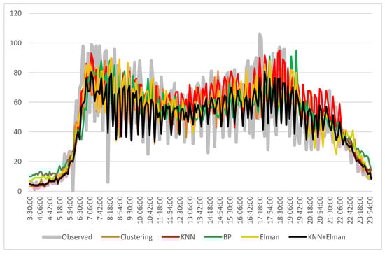 The developed models were applied to the validation dataset, which is to predict the traffic flow rate (number of vehicles per 6 min) during one week from 27 March 2019 (Wednesday) to 1 April 2019 (Monday). The prediction starts at 3:30 a.m. every day because the data collected during the first three hours from 0:00 a.m.–3:00 a.m .were used as the model inputs for the first prediction at 3:30 a.m. Thereafter, as the time window moves, a prediction will be generated every 6 min. As an example, the prediction results for the 1 April are present in Figure 7. Figure 7 shows the observed traffic flow and the forecasted traffic flows by different models. It can be seen that KNN performs best sometimes, especially in the afternoon and early evening (12:30 p.m.–6:30 p.m.). However, KNN + Elman performs better than KNN in the morning (8:00 a.m.–10:00 a.m.) and late evening (7:00 p.m.–10:00 p.m.). To compare the overall performance of different models, two quantitative performance measures were used.