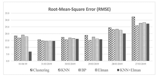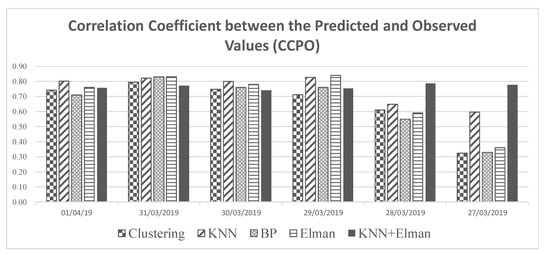 From Figure 8 and Figure 9, it can be seen that the KNN model consistently outperforms the clustering model, which is consistent with the findings in the literature [46,47]. Also, by comparing the BP model with the Elman model, it was found that the Elman model has better performance than the BP model in almost all six days. This result also reasonable because the Elman model enhanced the BP model by adding a context layer that feeds back the hidden layer outputs in the previous timesteps. The proposed 2-layer stacking model integrating the KNN and Elman methods has better or close performance than the KNN and Elman models. Overall, the proposed model outperformed all the other four models. Table 2 lists the overall six-day average performance of these five models in terms of their RMSE and CCPO values. It also clearly shows that the proposed model outperforms the other four models. The evaluation result indicates that the proposed 2-layer stacking model can more accurately forecast the intersection short-term (30 min) traffic flow than the four widely used existing models.