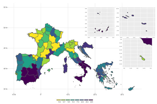 Mediterranean countries include the southern region of the European continent: Italy, Malta, Greece, Croatia, Bosnia and Herzegovina, Montenegro, Albania, Slovenia, Spain, Southern France, East Thrace or European Turkey and Cyprus. It also includes Portugal, Serbia, North Macedonia, Andorra, Bulgaria despite not having a coast in the Mediterranean Sea. Different methods can be used to define Mediterranean Europe, including its political, economic, and cultural attributes. Mediterranean countries can also be defined by its natural features—its geography, climate, and flora. Despite common features in term of climate condition and ecosystems, history, and cultural heritage, significant socio-economic differences still exist nowadays between the Northern Mediterranean countries (NMCs) and the Southern and Eastern Mediterranean countries (SEMC). Most of the NMCs are EU member states with an average income per capita much higher than the SEMCs [37]. With the exception of Malta, Mediterranean Europe countries were severely hit by the Great Recession [38], i.e., the financial and economic crisis that started in 2008 and brought about profound consequences such as political instability [39], a shrinking of welfare states [40], and higher socio-economic inequality [41]. Mediterranean countries have relatively high poverty rates [42]. Inequalities increased in some of those European countries which have been hardest hit by the crisis [42], in particular in Cyprus and Spain where the employment turbulence was greater than the European average [43]. During the last years (from 2012 to 2016), a downwards correction in the income level continued especially in Greece and Italy [43]. The Great Recession has had a deep impact not only on income inequality, but also on employment levels [44]. Despite the fact that the Europe 2020 Strategy’s objective was to reduce population in at-risk-of poverty by 20 million from 2010 to 2020 [45], in 2008 countries where at least 18% of the population live below the at-risk-of-poverty rate [46] were various, including Spain (19.8%), Greece (20.1%), Italy (18.9%) and Portugal (18.5%). Income level in Mediterranean countries is still more than 50% higher than that of Central and Eastern European countries, but the gap is closing from both sides. Among the poorest half of the population in the Mediterranean area, inequality hit mostly men [47].