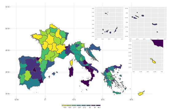 Even if the measurement of social exclusion is well established across European countries at national level, there is an urgent need for regional indicators since national level indicators are not necessarily appropriate or sufficient for regional analysis [2]. In order to estimate regional indicators, it is essential to choose the type of units to serve as ‘regions’. To this aim, the Nomenclature of Territorial Units of Statistics (NUTS) classification appears to be the most appropriate choice for EU countries [2,33]. The NUTS classification covers each country exhaustively, providing a hierarchical set of units (NUTS level 1, 2 and 3) for which data can be linked across different levels. Country are the highest classification units. Despite NUTS classification are widely used by different countries, this classification may differs in term of size and homogeneity across territorial areas. When constructing indicators at sub national level, it is essential to identify the level of geographical aggregation to which the income distribution is pooled with the aim of defining the relative poverty line. Since all poverty-related indicators in the Laeken list adopted by the EU are based on poverty lines defined in terms of the national median income, we will adopt the national poverty line to construct NUTS2 poverty indicators for selected Mediterranean countries. An alternative way for constructing regional poverty indicators is the use of regional poverty lines, which is based only on the income distribution within that region [2] thus producing intra-regional relative deprivation measures.