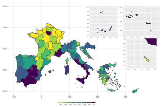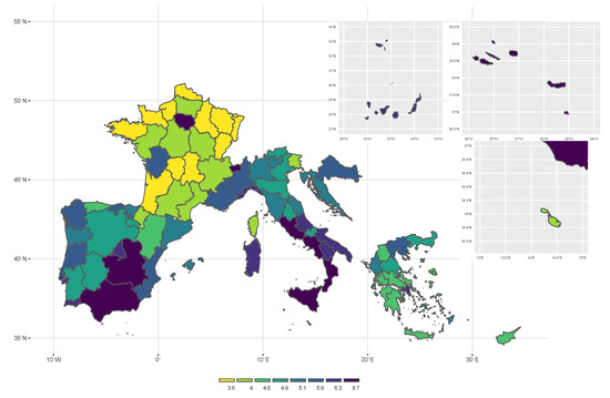 Regarding income-inequality indicators, the highest values for Gini coefficient and S80/S20 are found in Albania (35.28 and 6.7 respectively), Italy (33.33 and 6.08 respectively) and Portugal (33.57 and 5.59 respectively). Also in this case, high national rates are accompanied by concentration of poverty in specific regions. In Italy the estimated values of the GINI lies between 25.68 in Friuli-Venezia Giulia region and 36.02 in the Sicilia region. Similar results are found for S80/S20. In Portugal, the highest value of the who income-inequality indicators are found in the autonomous region of Azores, it is an archipelago composed of nine volcanic islands in the Macaronesia region of the North Atlantic Ocean (38.09 for Gini coefficient and 7.17 for S80/S20). High level of heterogeneity in income-inequality indicators are observed also in Spain: the autonomous city of Ceuta and Melilla (in the north of Africa) show the highest value of the Gini coefficient (40.73 and 38.44 respectively) and S80/S20 (8.67 and 8.34 respectively), followed by the Andalucia region, located in the Southern of Spain, for which the Gini coefficient is equal to 34.93 and the S80/S20 is equal to 6.36. On the contrary, Comunidad Foral the Navarra, located in the Northern Spain, shows the lowest values of these indicators (25.28 for the Gini coefficient and 3.73 for the S80/S20). Moreover, a similar pattern is observed in the case of France. High level of inequality are observed in the Provence-Alpes-Cote d’Azur, in the Southern France, and Ile de France, which is the most populous region of the France and it includes the city of Paris (the Gini coefficient is equal to 34.43 and 34.19); while the lowest values are observed in the Haute-Normandie and Auvergne regions, for which the Gini coefficient is equal to 23.43 and 23.93 respectively.