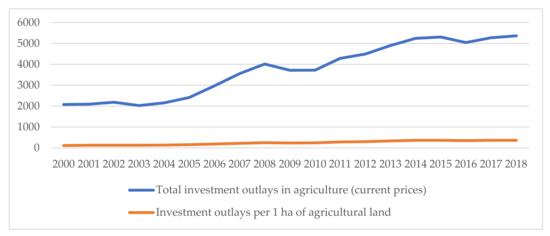 The highest increase of investment outlays in agriculture and hunting in the years 2000–2018 were found in the Lubelskie voivodeship (223.1 PLN per 1 ha of agricultural land), Małopolskie voivodeship (198.9 PLN per 1 ha of agricultural land), and Warmińsko-Mazurskie voivodeship (190.3 PLN per 1 ha of agricultural land). These voivodeships have the chance to increase the productivity, profitability, and the efficiency of agriculture. The increases in investment can also enhance the adoption of measures to reduce the negative side effects of agriculture on the climate and reduce greenhouse gas emissions [79].
