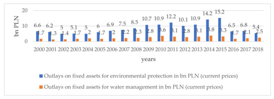 The changes in the level of investment are presented in the paper. We have used Central Statistical Office in Warsaw data for 2000–2018 to analyze the investment in agriculture and the environment in Poland and this data on the regional level. We used the CSO (Central Statistical Office) [56] data in Poland as the source of this information. We show the changes and present the results using descriptive, tabular, and graphical forms to describe the changes. We have also used the data from Agricultural Land Market in Poland to analyze the sale of land from the National Center for Agricultural Support [57]. To analyze the outlays on fixed assets for environmental protection and outlays on fixed assets for water management, we acquired the data from Environment analysis published by CSO [58].