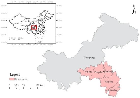 Chongqing is located in southwest China (28°10′–32°13′ N, 105°11′–110°11′ E). A total of 1.26 × 107 households inhabit there and the year-end resident population reaches 30.75 million in the investigation year, including 35.92% rural residents and 49.57% female [26]. Residents less than age 14 and over 65 years old take up 16.87% and 13.22% of the total population, respectively [26]. The area of Chongqing is 8.23 × 104 km2 and agricultural land in the year is 7.06 × 104 km2. It is the largest municipality and the only municipality that has the ethnic autonomous areas in China. The city has a humid subtropical monsoon climate, with hot summers and cold and humid winters. The area is mountainous, with mountain areas accounting for 75.8% [27], elevation difference of 2723.7 m, and vegetation coverage rate of 20.49% [28]. The study investigated Tujia and Miao ethnic minority rural households in the ethnic autonomous regions and non-national non-ethnic autonomous regions of Chongqing. Among them: Wulong and Qianjiang are non-national autonomous counties that have ethnic autonomous townships, and Xiushan, Youyang and Pengshui are ethnic autonomous counties. Figure 1 shows the location of the study area.