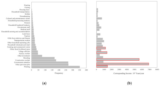 A total of 459 valid questionnaires were collected in the study, implying that livelihoods of 459 rural households were recorded. Families in the study area were divided into categories by the livelihood activities household members engage in. Frequency of household members that engaged in corresponding livelihoods was recorded. The results show that the income sources of rural households in the study area include five categories, corresponding to 29 kinds of livelihood activity—1721 person were involved (Table 2). Figure 2 shows the frequency of household members engaged in each type of livelihood activity (Figure 2a) and the sum of income from corresponding livelihood activity is calculated (Figure 2b). The five livelihood activities with the highest sum of income are highlighted with red rectangles in Figure 2. Planting, other part-time jobs, government subsidies, construction workers and breeding are the livelihood activities with the largest number of engaged household members in the region (Figure 2, left). Among them, planting is the livelihood activity with the largest engaged household number in the study area. The number of household members engaged in this livelihood activity was 352, accounting for 20.45% of all people engaged in livelihood activities. However, planting is not the main income source of households in the study area. Although the total income from this livelihood activity ranks third among all livelihood activities, this income only accounts for 5.43% of the total income in the study area. Among the 253 families that engage in planting in the study area, 112 families did not receive income from planting, indicating that many families only plant to meet their own consumption need, not to obtain disposable income. Similar to planting, among the 163 families in the study area who have members engaged in breeding activity, 86 families do not receive income from breeding. The five household livelihood activities with the highest income in the study area are: other part-time jobs, construction worker, planting, factory worker and other fixed salary livelihood types. Among these five livelihood activities, the three highest average incomes come from other fixed salary livelihood types, construction worker and factory worker, which rank sixth, seventh and ninth among the 29 livelihood activities. The average income from other part-time jobs income ranks 12th, and the income from planting ranks 25th. The three livelihoods with the highest average income are from household processing industry, medical staff and other household operating jobs.