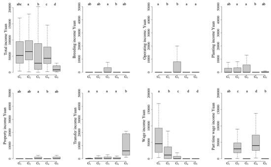 Boxplots displaying the differences in the income composition among the five family groups. G1 to G5 under the x-axis represent the family groups identified by cluster analysis. The boxes, horizontal lines in the boxes, and whiskers represent the interquartile range, median, and value ranges of the variables, respectively. The lower-case letters above the whiskers are the results of pairwise comparisons, with the same letters indicating no difference at p ≤ 0.05.