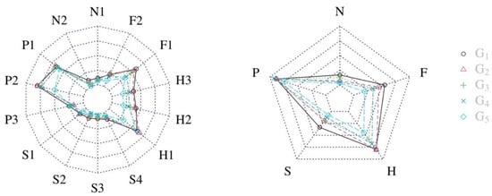 The study normalized each indicator of the rural households’ livelihood capital, and drew the profiles of the livelihood capital indicator in. The left panel of Figure 4 is the spider diagram of livelihood capital indicators, and the right panel of the figure is a livelihood capital pentagon whose weights were calculated through the entropy method. As Figure 4 shows, the livelihood capitals of G1 households are high, with the natural capital, social capital, and financial capital ranks first among all groups, physical capital ranks third and human capital ranks fourth. Combined with the results of the livelihood strategy, it might be deduced that households with abundant livelihood capitals tend to adopt a livelihood strategy of full-time job. The G2 households have the highest human capital, and they tend to adopt the livelihood strategy of both part-time and full-time job. The rank of livelihood capital status of G3 households is medium. Their natural capital and physical capital ranked second, social capital and financial capital ranked third, and human capital ranked fourth. There was little difference in the income compositions of households in this group with that of other groups. The G4 households has the most abundant physical capital, with natural, social, and financial capital being the second to last, and human capital ranking middle (third). The main livelihood strategy of this group is part-time job and its household income level is low (fourth). All of the four capital types of the G5 households are the lowest. Correspondingly, this group has the lowest income and accepts most transfer payment, such as government subsidies and gifts from relatives and friends.