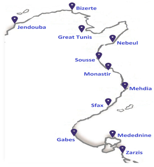 | Zone | Great Tunis | Bizerte | Nebeul | Sousse | Monastir | Mehdia | Sfax | Gabes | Beja | Jendouba | Medenine | |