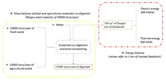 - Volume of material available to be composted: 50% FW + 50% GW = 55 m3 d−1 + 159 m3 d−1 = 214 m3/d;