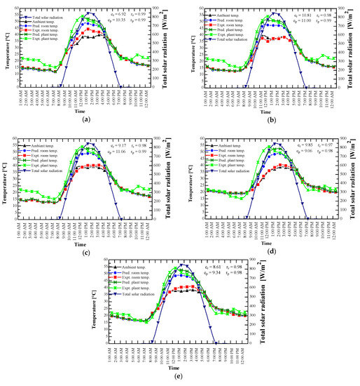 During December 2017–February 2018, the developed model has been experimentally validated for typical days. For naturally ventilated greenhouses, the experimental and predicted the values of air and plant temperatures (Tr and Tp), the ambient air temperatures (Ta) and solar radiation for typical days, i.e., on 26, 27, and 28 January 2018, have been shown in Figure 2a–c. Similarly, for the forced ventilation in greenhouses, the values of above-mentioned parameters for typical days, i.e., on 7 and 8 February 2018, have been shown in Figure 2d–e.