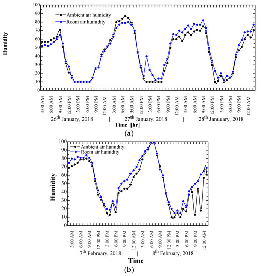 Hourly variation of humidity for ambient and greenhouse air with natural ventilation (a) during 26, 27, and 28 January 2018; (b) during 7 and 8 February 2018.