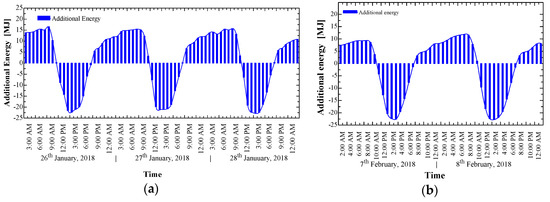 Hourly estimated values of extra thermal energy requirements for naturally ventilated greenhouses during 26–28 January 2018 and for forced ventilated greenhouses during 7–8 February 2018 have been shown in Figure 4. As can be seen from Figure 4, from 10:00 a.m. to 05:00 p.m. no amount of additional heat is required. During this duration, the heat should be absorbed from the greenhouse to maintain the desirable plant temperature. Natural ventilation is the easiest solution to enable the elimination of surplus thermal energy from the greenhouse by opening the greenhouse. In the case of greenhouses with forced ventilation, the additional energy requirements were lower in the mid-day hours.