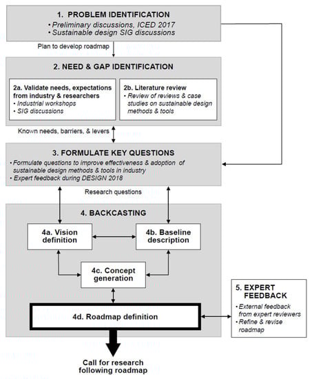 This research roadmap takes the form of key research questions for design-related academics and others to pursue, broken down into more specific subtopics and into short-, medium-, and long-term tasks. Each task may be a Ph.D. thesis, sponsored project, or other collaboration between universities and companies to ensure the design and development of sustainable products and services. This article’s structure focuses more on the roadmap than an extensive literature review. The following sections describe the methodology in detail, then results are subdivided into the vision, baseline situation (listing most literature), and the roadmap itself; a discussion follows, including limitations, and lastly the conclusion suggests next steps.