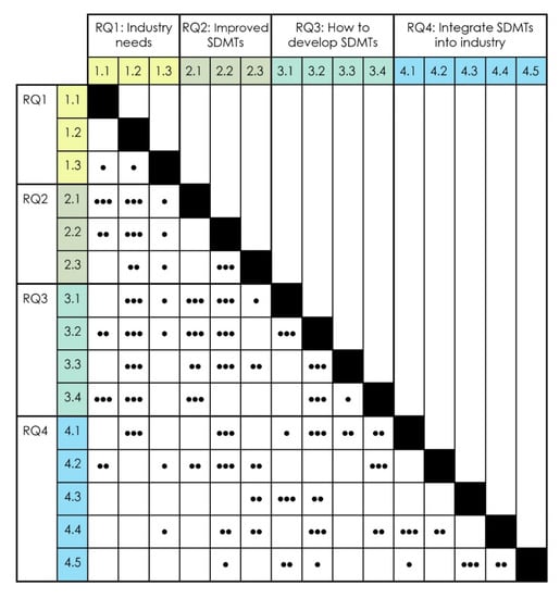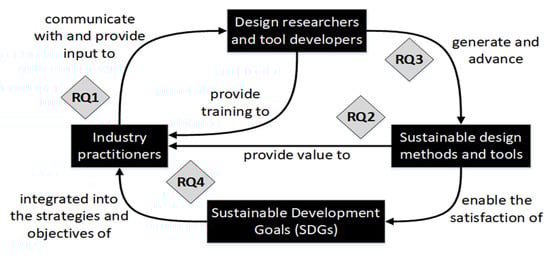 The results from the latest developed or improved SDMTs are regularly shared across industry and provide both sustainability and business advantages. In many cases, SDMTs are accompanied by illustrative case studies that help companies understand the benefits and update their sustainability practices. The SDMTs guide companies in developing sustainable innovations, even restorative innovations, and they also support the creation of strategic roadmaps for sustainable development solutions that integrate perspectives from all departments within companies. There is a clear incentive for management and companies to collaborate frequently with researchers on SDMTs, specifically using action research and case studies. Figure 2 presents a summary systemic diagram of this vision and how the research questions fit into the elements and connections in the vision.