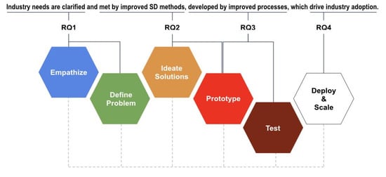 To move the design research community from this baseline toward the desired vision, a roadmap is suggested, setting a course in four parallel and intersecting paths associated with the four research questions (RQs). Because the goal is for industry product developers to adopt these SDMTs within design contexts at scale, an analogy is drawn between the four research questions and the Design Thinking, or Human Centered Design, process [65], shown in Figure 3.