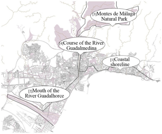 The following areas of sports concentration can be highlighted: (1) coastal shoreline, (2) mouth of natural channels such as the River Guadalhorce, (3) natural surroundings and large green areas such as the Montes de Málaga natural park and (4) channeled riverbeds near central urban environments like the course of the River Guadalmedina. The three first study areas have their proximity to a natural place. As in much of the earlier research, the role of natural settings as generators of informal sports activity is highlighted. In turn, those are divided into two categories: the spaces close to the marine environment (coastal shoreline and mouth of the River Guadalhorce); and the spaces near to a natural green area (Montes de Málaga natural park and the course of the River Guadalhorce).